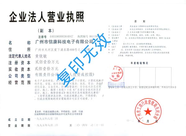 信康科技基本情况成立时间:1995年6月 业务性质:制造厂,开发研发、批发商 税务性质:一般纳税人 工商登记经营范围: 电子产品批发;信息电子技术服务;电子产品零售;保安监控及防盗报警系统工程服务;安全技术防范系统设计、施工、维修;办公设备批发;五金零售;五金产品批发;计算机技术开发、技术服务;信息技术咨询服务;计算机批发;开关电源制造;计算机应用电子设备制造;计算机信息安全设备制造;安全智能卡类设备和系统制造;不间断供电电源制造;稳压电源制造;电线、电缆制造;光纤、光缆制造;绝缘制品制造;防雷设备制造;安全技术防范产品制造;安全检查仪器的制造;洗涤机械制造;机器人修理; 市场定位:研发制造安防产品,电线等,批发安防行业知名品牌产品,综合型一站式器材服务供应商